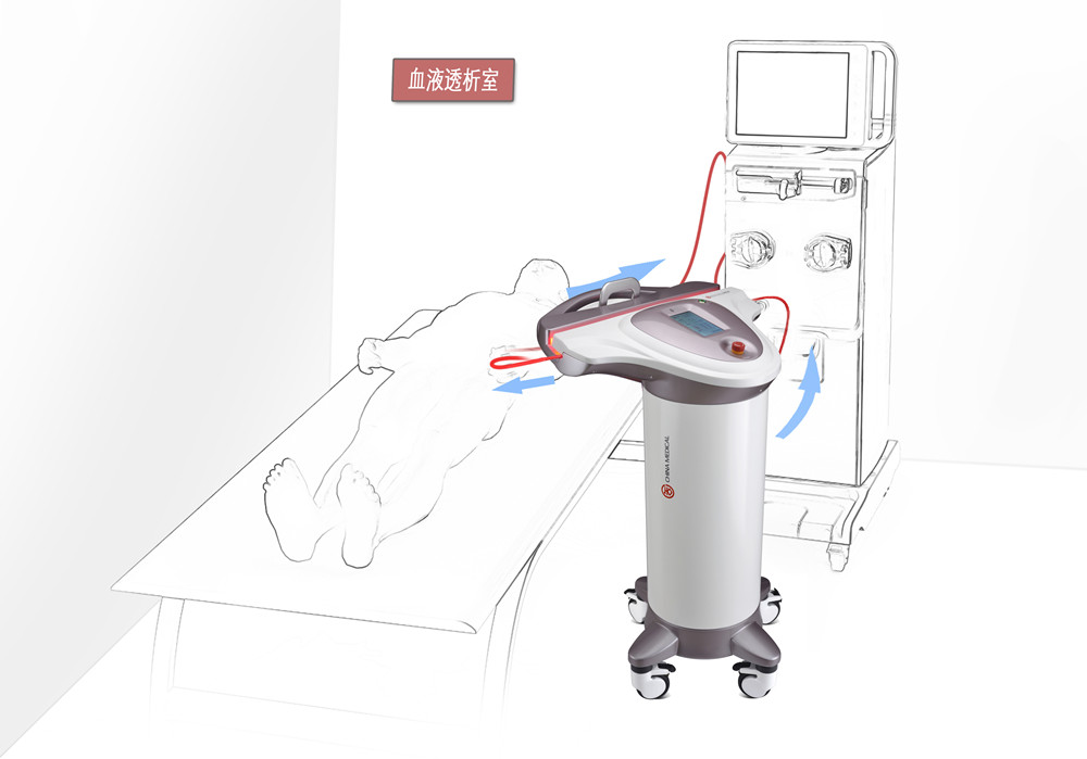 通过在患者血液透析过程中对体外循环的血液进行照射治疗,以消除或者缓解透析过程中产生的氧化应激反应带来的损伤和并发症,减轻患者的痛苦,延长患者的生命,提高患者的生存质量,降低患者的治疗负担。血透天使创造性地把红光治疗与血液透析有机地结合在一起,在血液透析患者氧化应激这一医学难题的治疗上取得突破性的进展。同时改变了目前血液透析只能进行肾功能的部分替代作用,无法解决同步治疗的难题,血透天使的出现使这一状况得以改善。