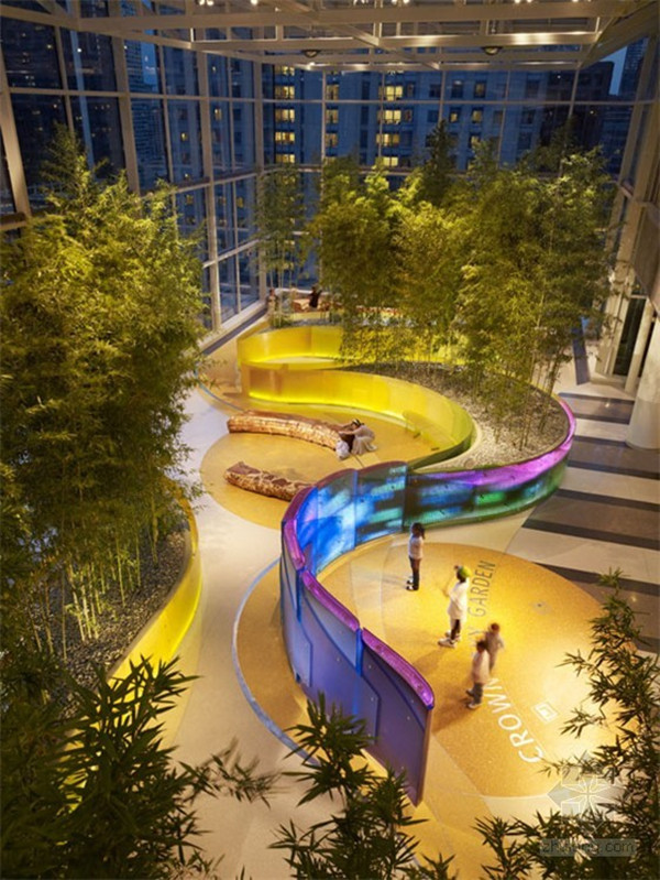 在顶层的花园中,采用了园林设计的方法,创建了一个生机勃勃的康复花园,光、水、声、色交织,多种颜色的光墙蜿蜒而过,包围着园中的竹林,花园的中心有安全树脂墙壁和当地再生木质雕塑玩具,使小病人们在这个梦幻的空间中,可以放心的接触大自然,创意的设计不仅缩短了患者的治疗恢复时间,同时为医疗保健设计提供了新的示范。